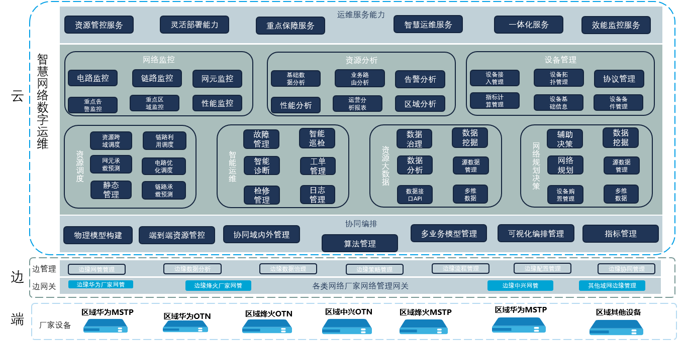 網絡運維便捷可(kě)視(shì)化(huà)能(néng)力需求綜合網管納管華為(wèi)、中興、烽火(huǒ)全區(qū)EMS系統,實現(xiàn)存量數(shù)據統一(yī)管控(模型數(shù)據統一(yī)),實現(xiàn)域間(jiān)資源可(kě)控、域內(nèi)資源數(shù)據實時(shí)更新管理(lǐ),實現(xiàn)全域電(di àn)路(lù)端到(dào)端呈現(xiàn),便捷輸出端到(dào)端能(néng)力資源。